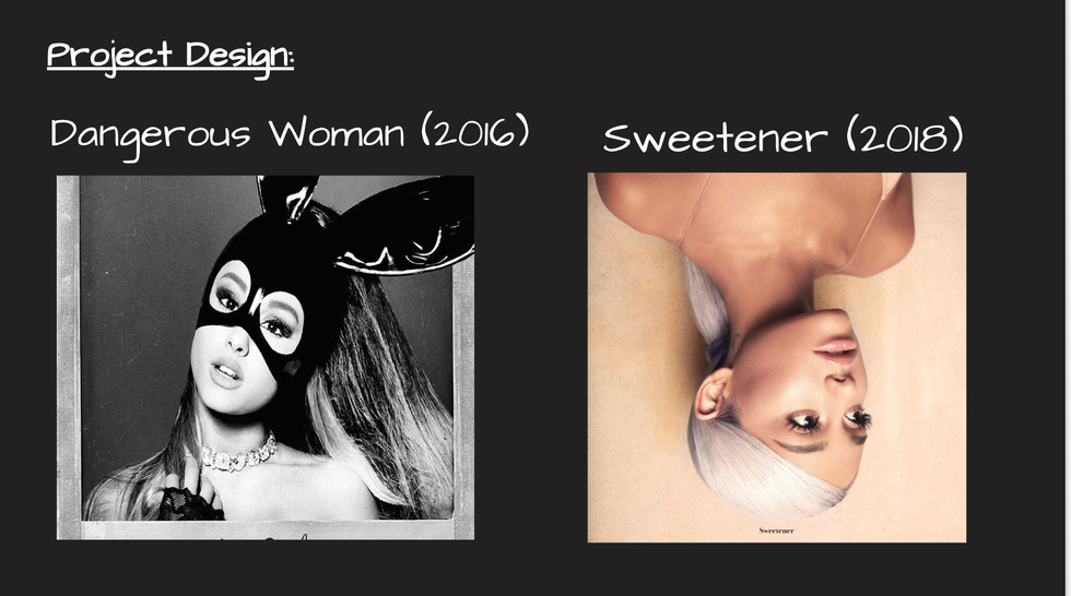 For my project, I was particularly interested in researching Beyoncé and Ariana Grande. Although I am biased and adore both artists, I was interested in finding out if other collegiate women felt as empowered as I do when listening to their songs. First, I picked two Ariana Grande songs; I tried to pick an older song and a more recent song. I picked "Dangerous woman" off of Ariana's album "Dangerous Woman" from 2016. Then, I picked a more recent Ariana Grande song, "God is a Woman," off of her album "Sweetener" from 2018.