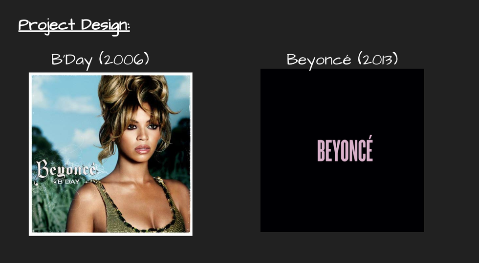 Then, I picked two Beyoncé songs. Again, I tried to pick an older song and a more recent song. First, I selected "Freakum Dress" from Beyoncé's album "B'Day," from 2006. Then, I picked "pretty hurts" from Beyoncé's 2013 album "Beyoncé."