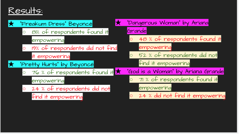 So... basically, in my study, a majority of respondents found Beyoncé's songs to be more empowering than Ariana Grande's.