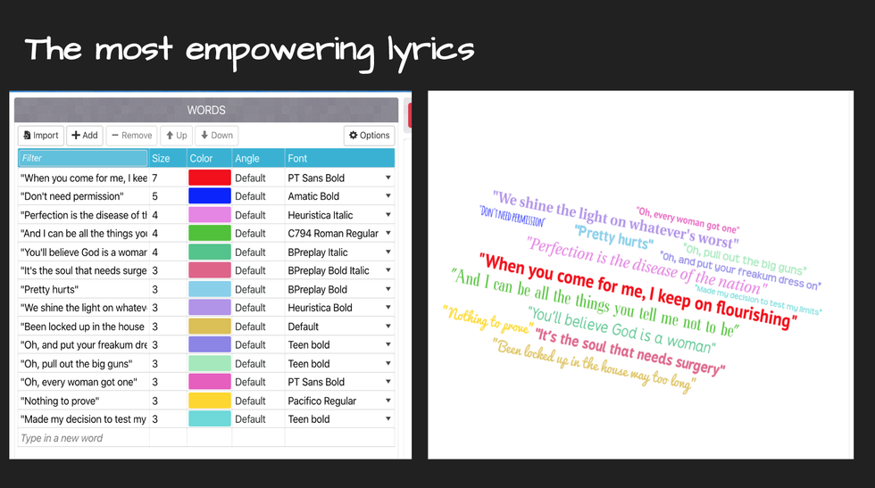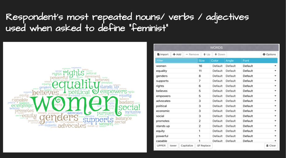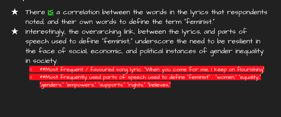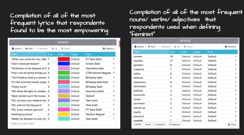 I decided to dig deeper and compared the nouns, adjectives, and verbs that my respondents used to define the word "feminist," to the lyrics that my respondents had included based on the songs that they found to be empowering.