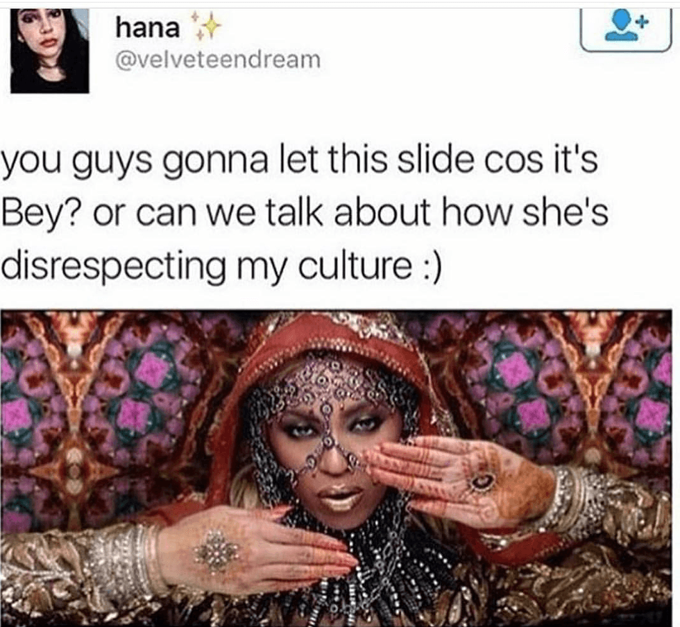 However, people are not paying much attention to Coldplay: the main focus is more on Beyoncé, who is harmonizing throughout the song. Some Indian people and other people of color are having a problem with the Indian attire she wears during her appearances, as she is dressed in traditional Indian clothing and henna. Viewers are saying that this is cultural appropriation, as Beyoncé is using the Indian clothing and henna as an aesthetic vision to make it more appealing for the video. As this controversy spills onto Instagram and Twitter, people are commenting that just because Beyoncé is a person of color doesn't mean that she can dress in these clothes and get a pass.