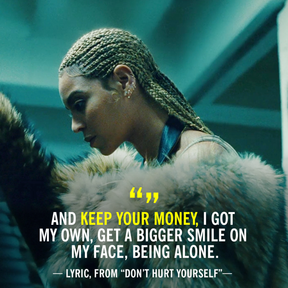 More lyrics from this song are, "When you hurt me, you hurt yourself; try not to hurt yourself. When you play me, you play yourself; don't play yourself. When you lie to me, you lie to yourself; you only lying to yourself. When you love me, you love yourself." As his wife, her role in his life was to benefit him. It should have been mutual, but unfortunately, it was not. In this song, Beyoncé shed light on how much of an asset she was. She was not just a pretty face, she was someone who was valuable and important. By losing her, he was damaging himself. He was "losing out on a good one." He was "playing himself", as DJ Khaled would say. He was not looking at her and recognizing the woman he married was not just an average person. She was "lit". After listening to this album, I decided to tell myself everyday, "Don't let anybody 'sleep on you.'" Don't dumb down your own intelligence, or lower your standards to be loved by anyone, especially not a man. If someone does not love you and all the flaws that come with you, then don't change yourself to please that person. If someone truly loves you, they will help you to better yourself. If they see that you are lacking in an area, instead of constantly putting you down in that area, they should be giving constructive criticism and directing you, with the help of prayer, on a better path.