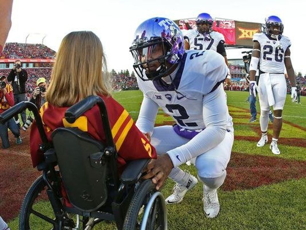 Earlier this month, Boykin made headlines. He holds over 2,500 passing yards, over 400 rushing yards, and 25 touchdowns so far during this season alone. However, that is not the reason for his media focus. On Oct. 17, TCU took the field at Iowa State University. That particular game welcomed Abby Faber, a seven-year-old visitor from Blank Children's Hospital diagnosed with spastic diplegia cerebral palsy. Abby was chosen to be the honorary team captain for ISU. During the coin toss, TCU and ISU naturally shook hands and shared typical sportsmanlike remarks. It was then that Trevone Boykin knelt down and acknowledged little Abby. They shared a short conversation, and immediately after, Boykin went over to the sideline and said a prayer for her. It was a discrete action, but recognition spread over the next few weeks.