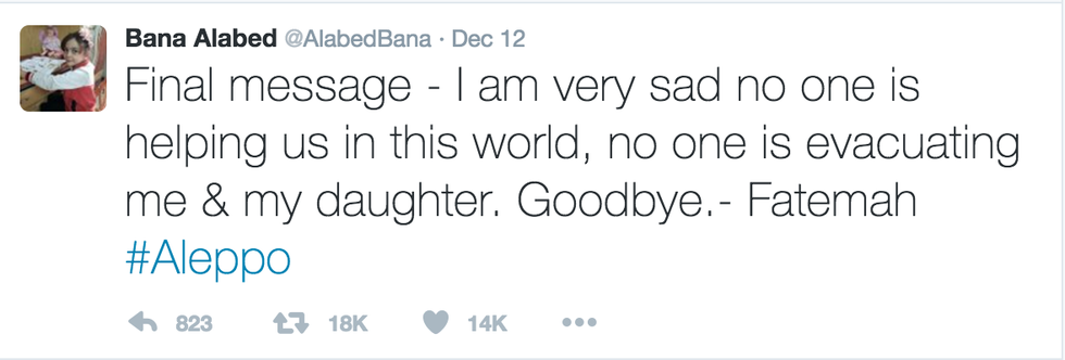 I was encouraged and inspired by a seven-year-old girl from Aleppo, Bana Al-abed, whom The Washington Post has already dubbed the "Anne Frank of the Syrian civil war." Anne Frank didn't have Twitter, but Bana did, and she has been sharing over the past few months her daily life as a citizen of Aleppo under the crossfire of war. Her last tweets were videos of her mom showing the brutality of airstrikes near Bana's home and a heart-breaking farewell.