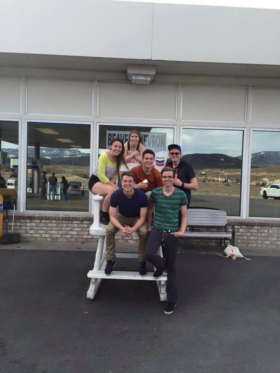 Pictured from left to right: Morgan Parent (me), Paul Davis, Juliet Demars, Devon Anderson, Matt Jackson, and Hayden Brady on the chair at the Chevron gas station in Beaver, Utah on our way to AZ Fantasy (a quidditch fantasy tournament) in March 2016.