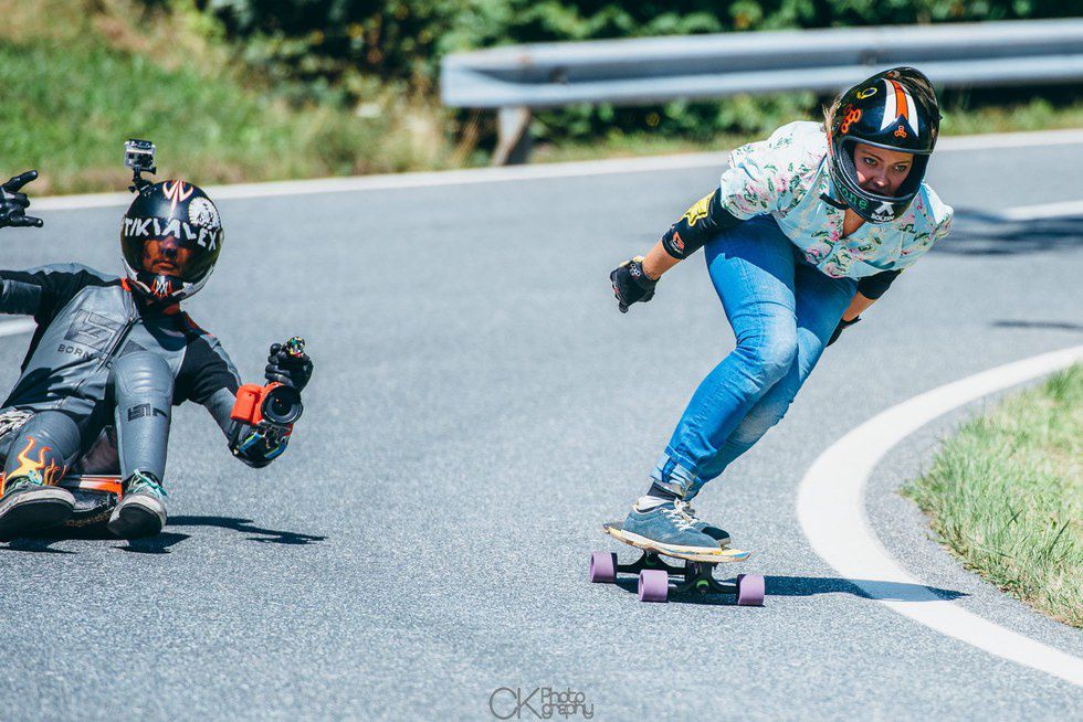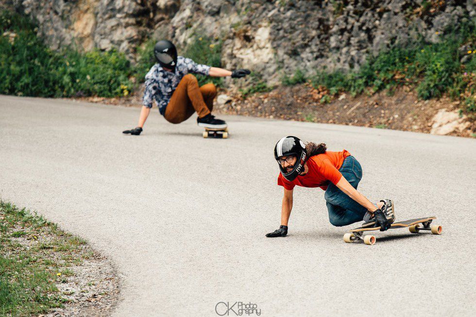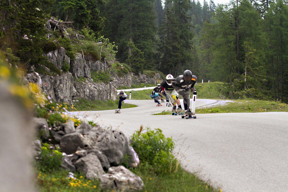 After reflecting on the success in Loedersdoef, the next step seemed logical: why not go bigger and better? That’s exactly what BMS has done. Along with a small festival in a village, BMS has been able to take over the reins of KnK in Slovenia (one of the world’s biggest freerides), but they have also managed to close down 2 other big mountain roads for three-day long freeride festivals. But these aren’t your average ‘pitch your tent and skate a chill road’ type of freeride. These hills challenge even the best of skaters. Both of the Austrian roads being longer than 8km long, the strait sections send skaters to careen down mountain passes into tight 180 degree hairpin corners, which have minimal padding and protection (seriously Europe, not all of us have socialized health care services. Get some padding on those roads). These hills are so physically demanding, that world class athletes are happy to call it quits from exhaustion after 3 or 4 runs to retire and start partying at noon.