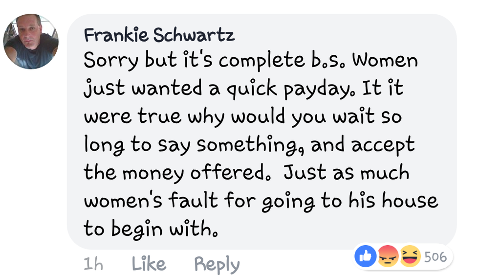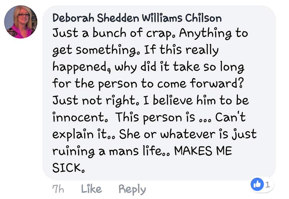 I was disgusted with the amount of comments I encountered of this nature. There were so many. Some saying "He would never do something like this, I don't believe his accuser, he was such a sweet man." -- people were saying this about a man they have never met and have only seen through television.
