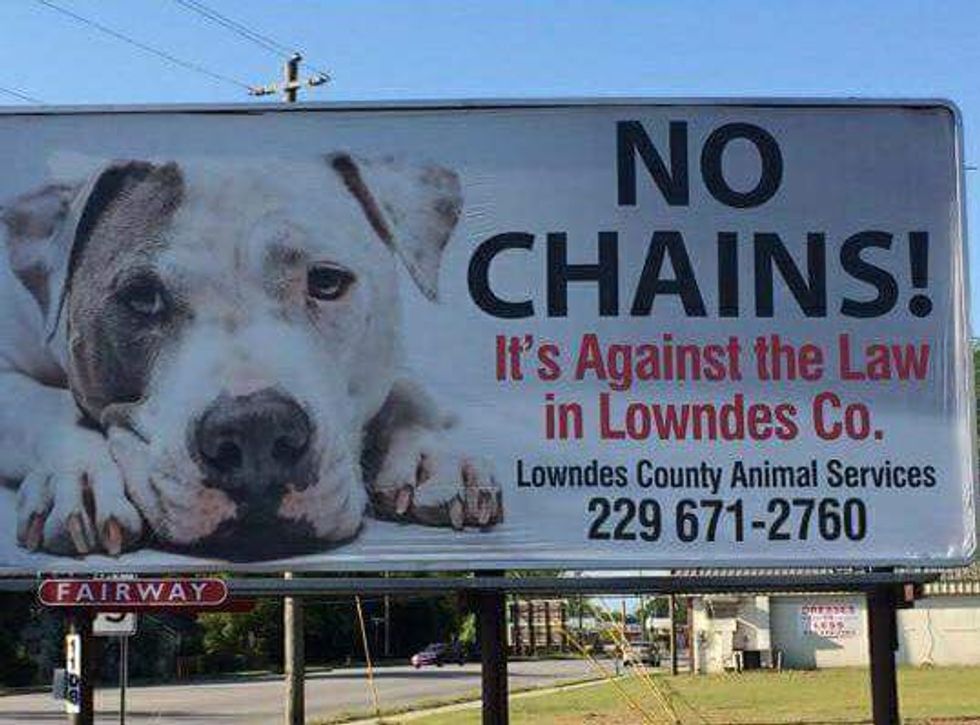 As of April 2017, after an extensive fight, the Board of Commissioners of Lowndes Co. and animal rights activists' push for anti-tethering became “billboard official”, right in the middle of town! If you have driven down North Ashley street within the last month, you probably noticed the large billboard now reading: "No Chains! It's Against the Law in Lowndes Co."