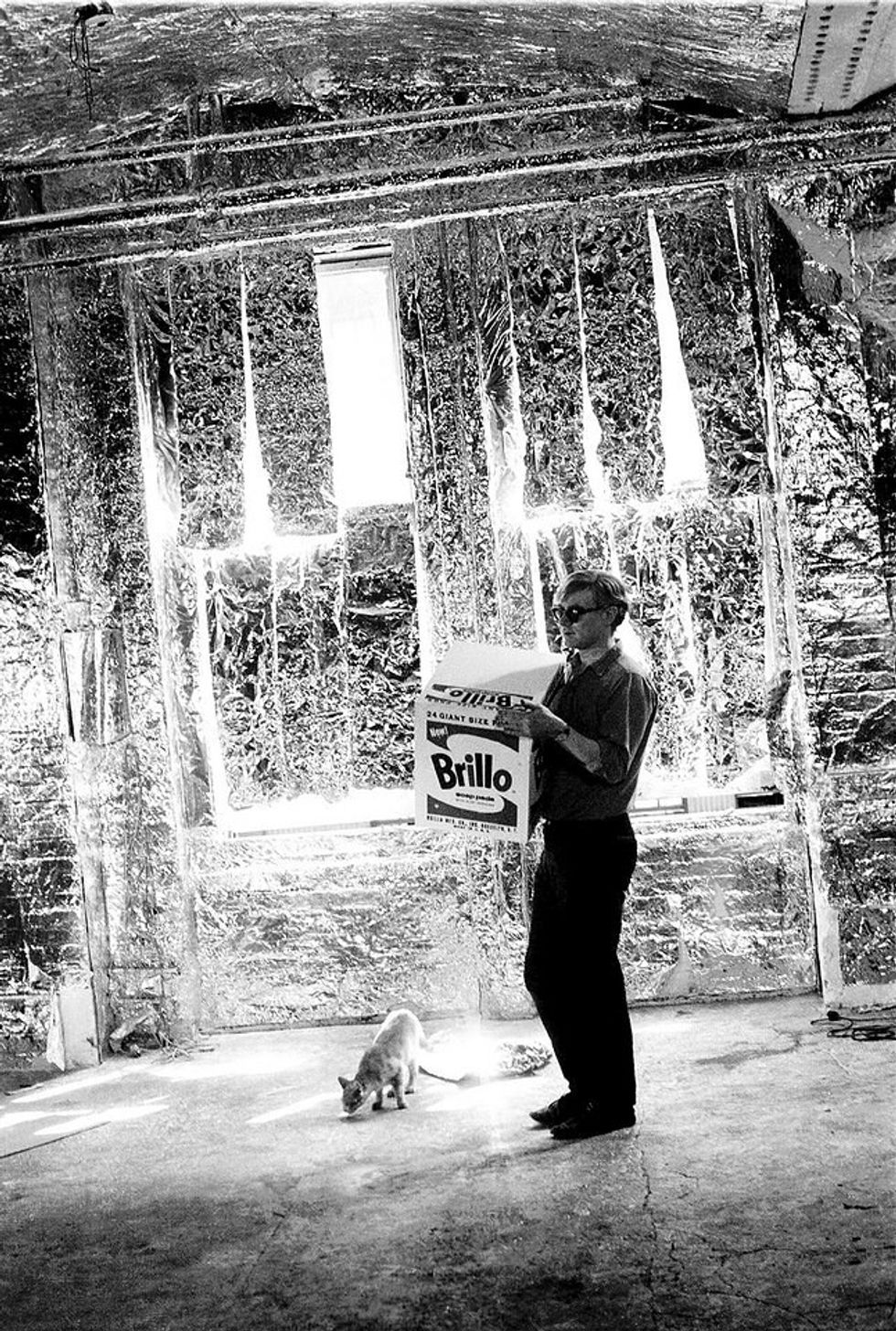 Andy Warhol with a Brillo box and cat by Billy Name, 1964