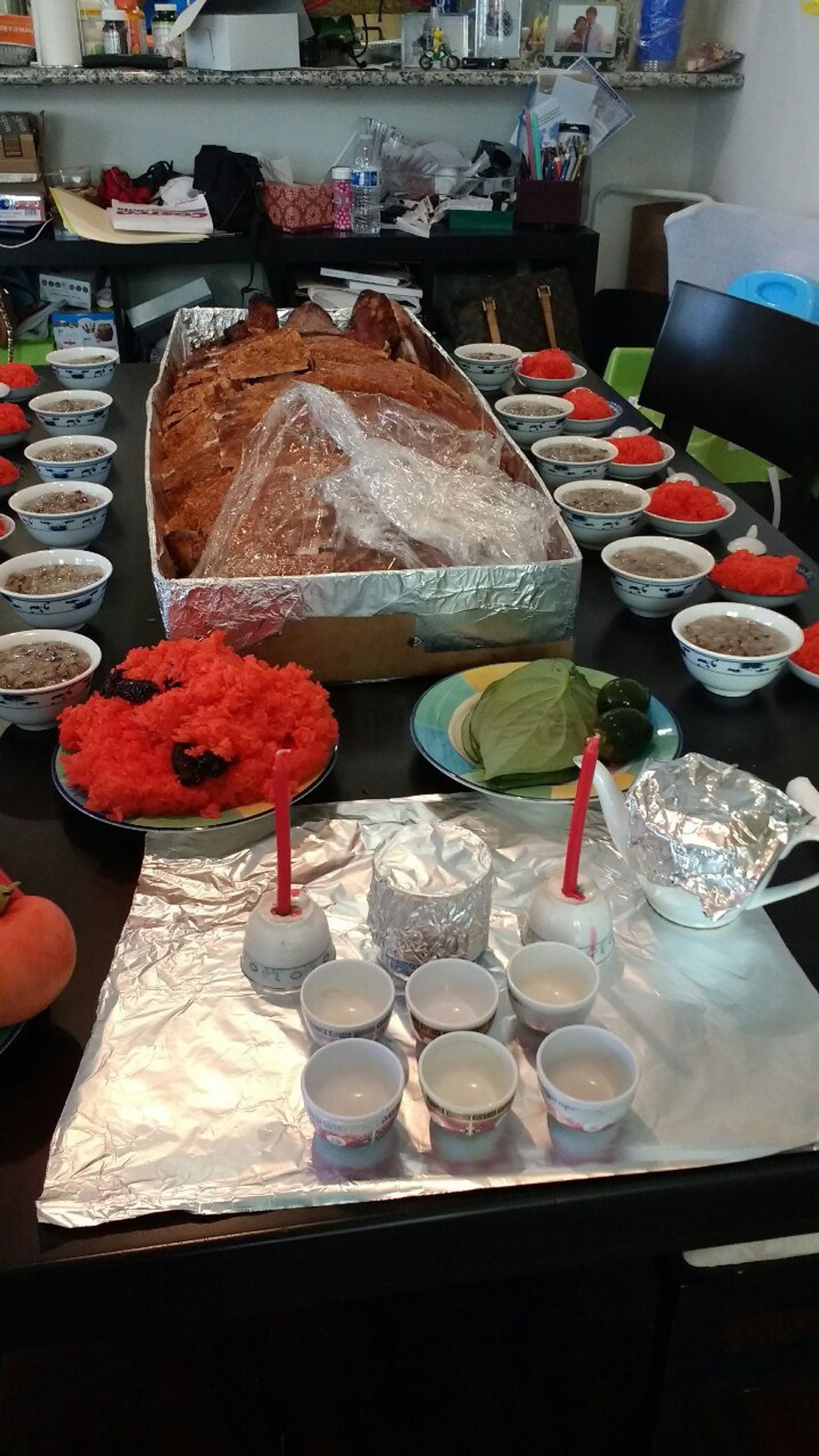 The first birthday tradition includes offerings to the 12 Guardian Midwives called Bà Mụ. These godmothers are reverenced as guardians for children and have protected babies since their conception. The 12 are said to represent the 12 different months of the year. A prayer is said over the items wishing the baby will be successful in life. To pay respects to Bà Mụ for my cousin Colin's birthday, my family offered 12 bowls of sweet sticky rice, 12 bowls of a Vietnamese dessert called Chè, some persimmons, a bouquet of flowers and a roast pig.