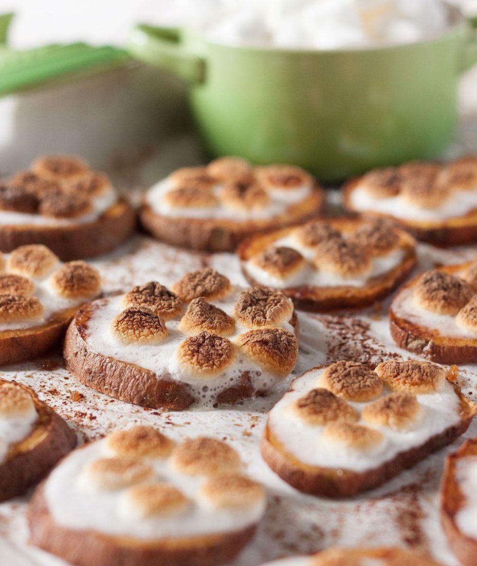 5. Once the potatoes finish cooking, remove the tray from the oven and quickly add marshmallows, placing 1 marshmallow on top of each stack of potatoes. Turn the oven to the broiler setting and put the marshmallow topped stacks under the heat for 1 minute.