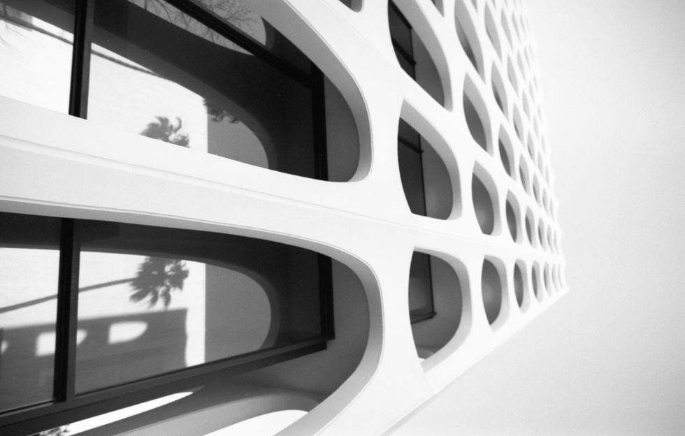 I love this shot because it was very hard to shoot, and turned out really interesting. I crouched way down to shoot almost straight up at a building. In the next shot, you can notice the palm tree reflected in the window. This shot is so smooth, it almost looks 3D rendered.