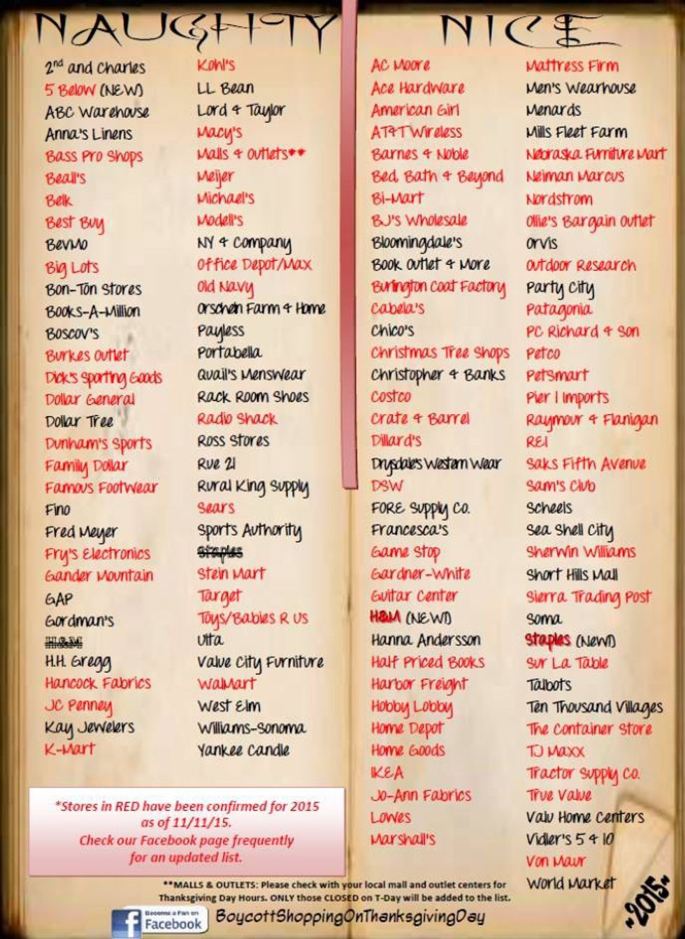 You can also find a Facebook page that is dedicated to "boycotting" the retailers that are open on the day of Thanksgiving. Here is the link to that page. This page has also created a "naughty" and "nice" list, this list contains the stores that are open and the stores that are closed on the day of Thanksgiving.