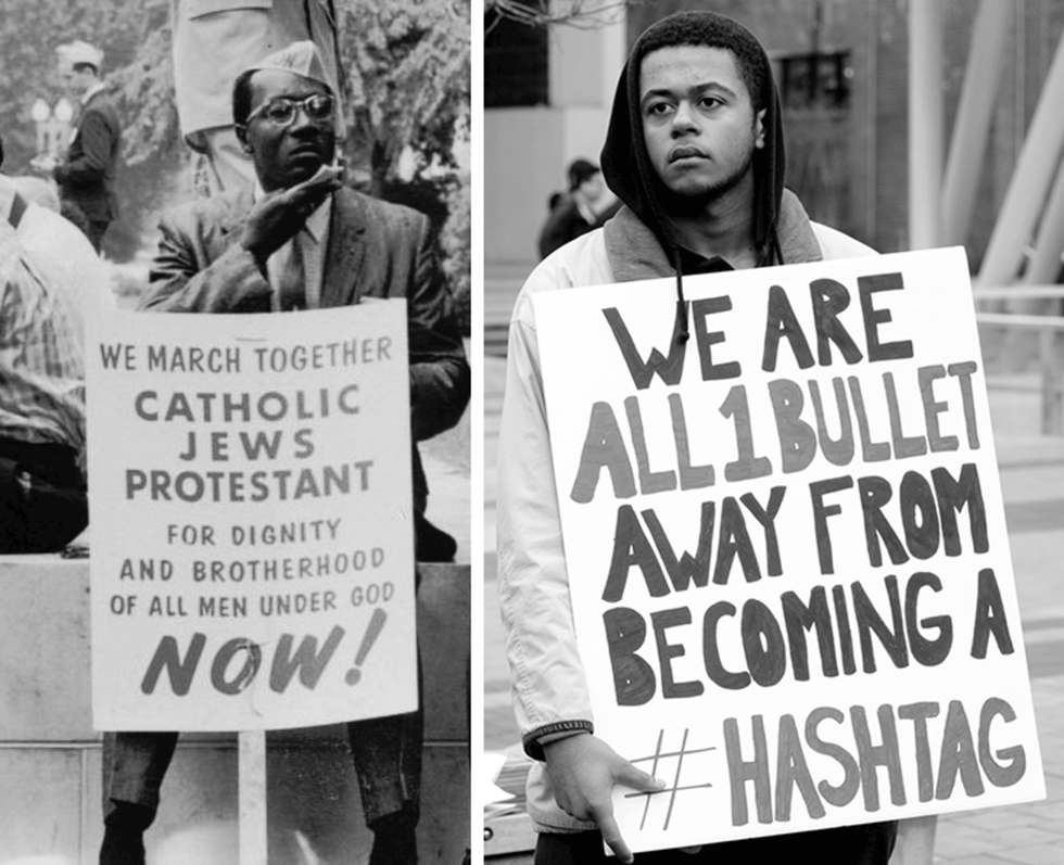 Many of the same social and political ideals and issues have plagued our country since the first white Europeans step foot on our now American soil. However the idea of justice has reign supreme and has had to constantly alter its definition throughout history to fit the criteria of those who seek it. In recent times the Black community is trying to form a more modern definition. Their definition entails the ability to feel safe walking down the street, riding in their automobiles, and living in their home without the “fear” of being executed. Many in the Black community feel just not long ago that that their grandparents generation marched and fought alongside Martin for civil rights, but yet here it is again. Becoming increasingly clear, the recent generations “Black lives Matter” Movement shows evident that the new movement has used some of the same tactics and strategies that were first laid down by the civil rights movement.