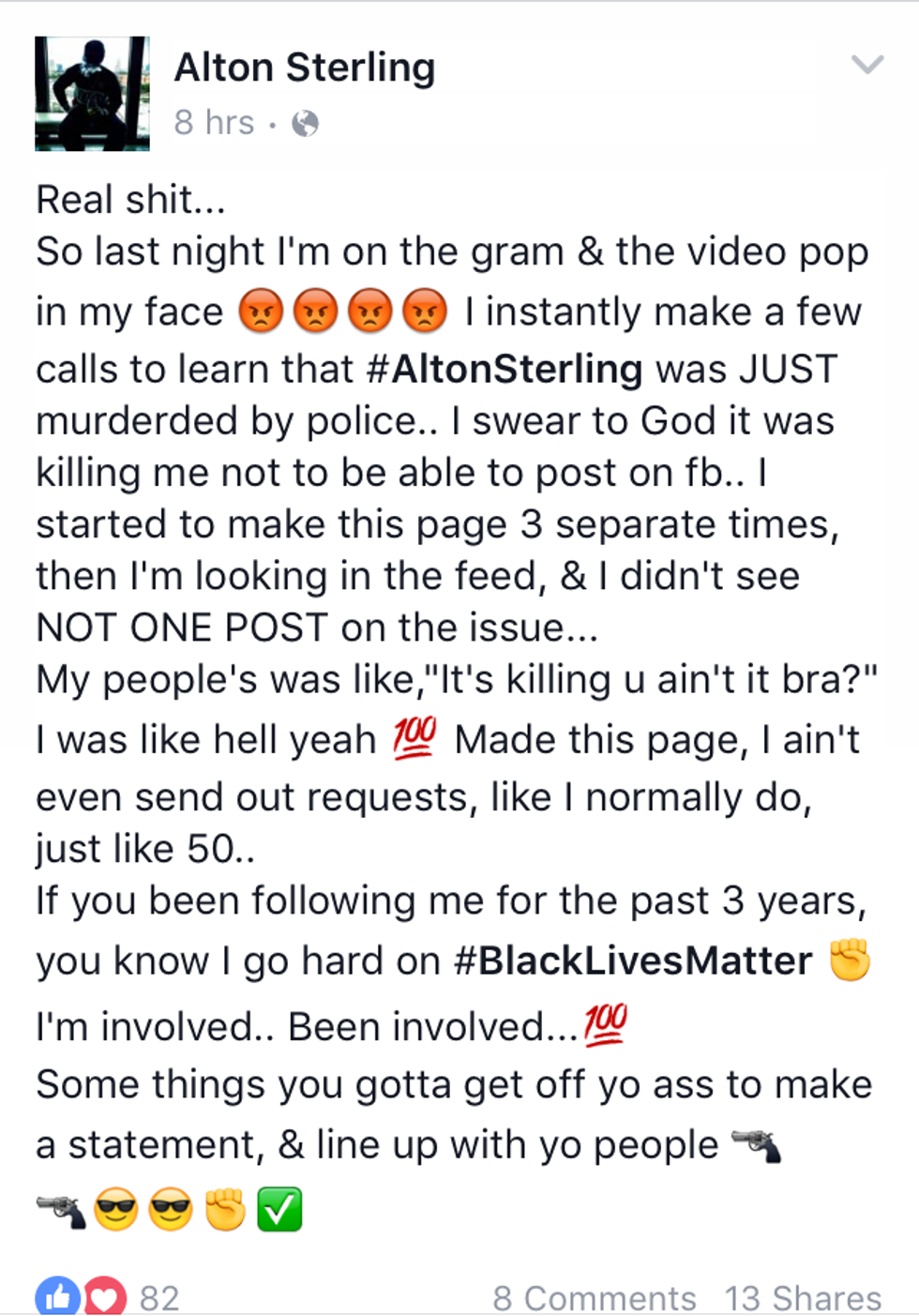 I reported "Alton Sterling" as a fake account. In the first place, the page creator didn't need to run a page which didn't promote the ideals of the true Black Lives Matter movement. Stirring hate only causes more trouble for all parties involved. Secondly, Alton Sterling did not deserve to have his name attached to a crime-supporting, hate-inducing web page he never agreed to begin. There are no words to express Alton's sentiment because Alton Sterling is gone. The tragedies that have occurred in this season are traumatizing, heartbreaking, and entirely avoidable. However, it is important to understand something.