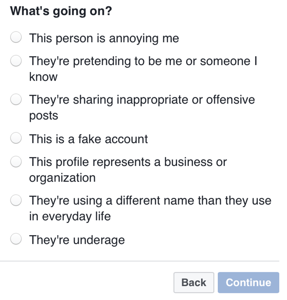I reported it not because of the support for the Black Lives Matter movement, which I support, myself. I could even let the first paragraph go. However, BLM supporters don't deserve this as their front runner. They don't deserve a "Hell yeah," "Get off yo ass to make a statement." *gun emoji, gun emoji*. I did some research. The creator of this page, who will not be named, hasn't gotten off his own "ass" to do anything for the movement. His idea of activism is creating a Facebook page and painting it with hate filled obscenities. His idea of supporting Alton Sterling is the ultimate death of white police officers. I reported the page. Not because it violated any community standard. When reporting a profile, several options are listed.