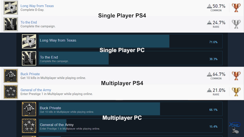 This causes a permeating assumption that close to no one plays the campaign for "Call of Duty" anymore, or whoever does has significantly declined over the timespan Bunting states. YouTuber YongYea has soft numbers that provides to the subject at hand of being incorrect. YongYea confidently expresses the fact that the recent "Call of Duty" title "WWII" can prove Bunting’s allegations wrong. The game has reached about 20.7 million people over all platforms like PS4, Xbox One, and PC. With Playstation 4 having a whopping number of about 12.1 players of that 20 million. For this case, YongYea uses the percentages of Playstation Trophies and Steam’s Global Achievements to show the numbers.