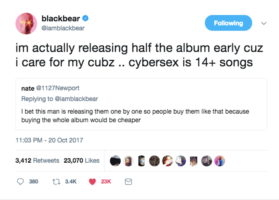 Blackbear has slowly been releasing bits and pieces of his newest album, “cybersex." Some people had accused him of wanting to make more money off individual singles, rather than bundling into an album, but on Twitter he cleared the air, and I respect that. It is nice to be able to hear some new songs from an album, especially more than one. Listening to the same song over and over kills the mood and gets old.