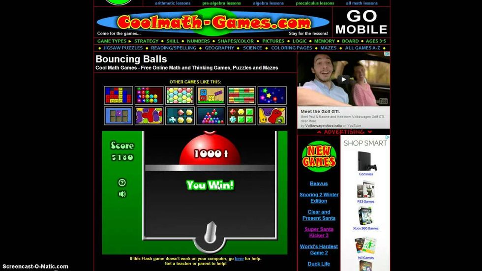 Can't you just feel the anticipation of that weight dropping on you because you didn't clear all the balls in time?? A classic rainy day game, Bouncing Balls requires you to hit the ball under the weight with a ball from the gun (the arrow-looking thing at the bottom) of the same color. Beat the clock or you're screwed, man. Check the game out here: https://www.coolmath-games.com/0-bouncingballs