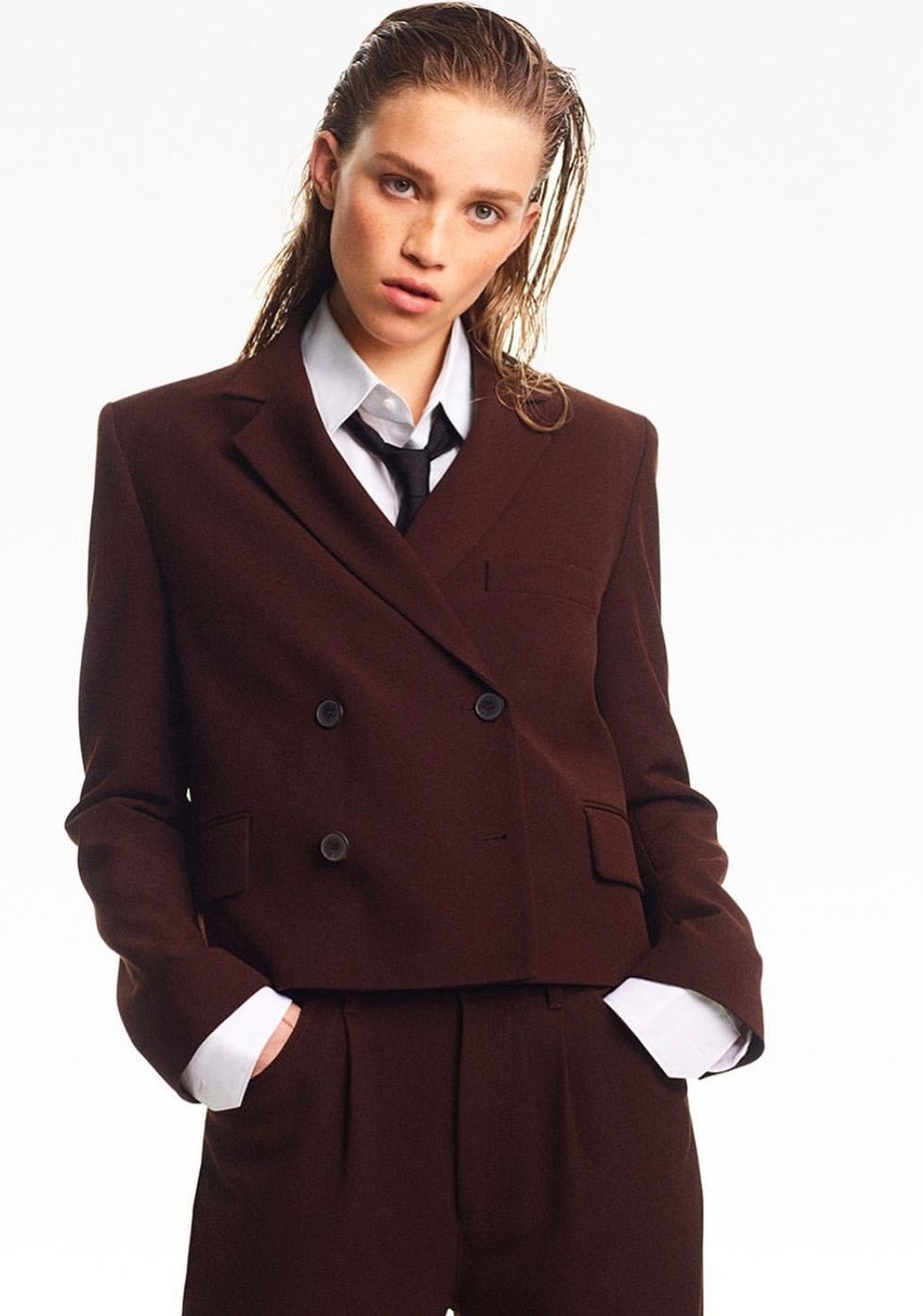 This cropped double-breasted maroon blazer with matching pleated pants from ZARA is the perfect structured pantsuit to leave you looking powerful and confident throughout the entire workday.
