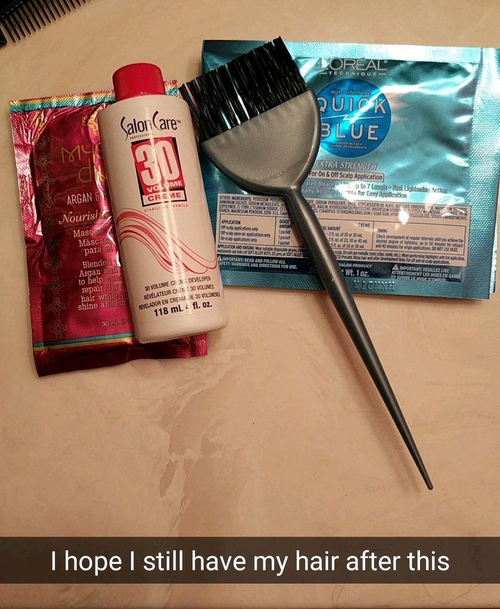 Without any professional help, I bought myself some supplies. I skimmed some articles (most of them telling me how dangerous it is to bleach your hair on your own) and dug back to over a year ago to try to remember what my cousin bought for my hair. This is what I ended up getting.