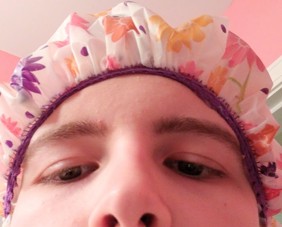 I mixed the bleach and the developer together and just put that bleach all over my hair. No mercy. Then I covered it with a shower cap and waited. Here's an unflattering picture of me waiting.