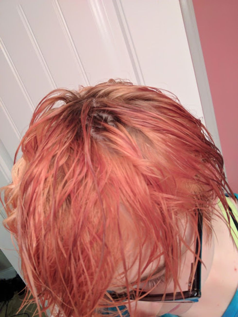 I wasn't super pleased. Don't worry, I knew I wasn't going to get it blonde after bleaching it once. I was expecting the pink. I was more concerned about the places I had missed completely, like my roots and the sides. Luckily, I bought extra bleach. This next time around, I got my lovely sister's help with all the parts I missed.