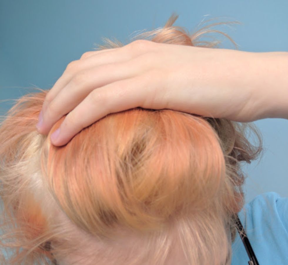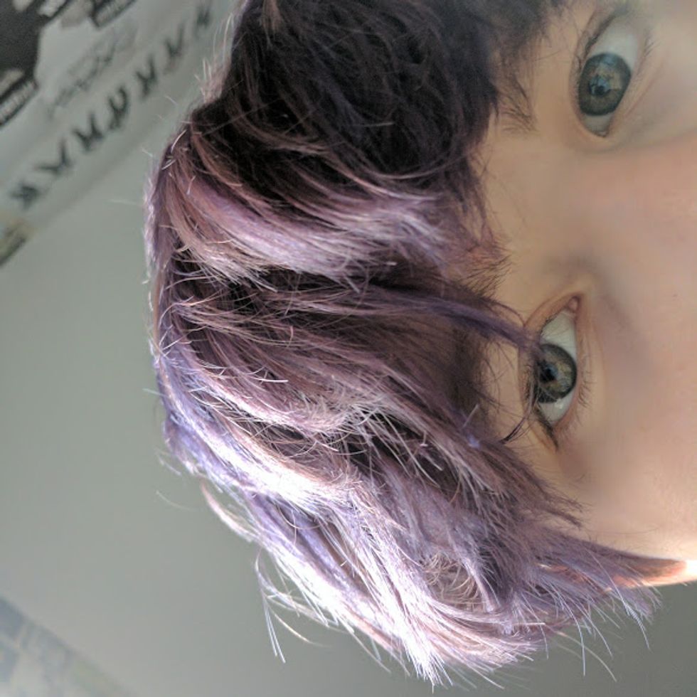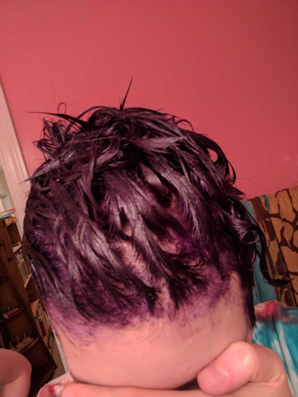She got all of the essential spots and then put the remaining bleach on the rest of my hair. I kept it in for another 10 minutes. I wasn't too concerned about getting an even color throughout, because I knew I was going to put purple dye over it anyways.