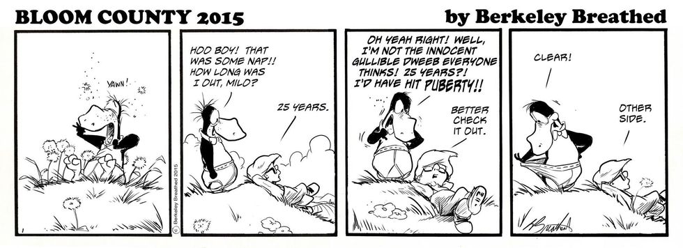 Rejoice, America! After a 26-year hiatus, cartoonist Berkeley Breathed rebooted his world famous, Pulitzer Prize-winning comic strip, "Bloom County" (Ask your parents). Appearing as "Bloom County 2015," the first strip of the new iteration appeared on July 13, 2015 and sent the Internet into an apoplectic frenzy. The strip, pictured below, brings back two of the original strip’s beloved characters, Opus and Milo, waking up from a very long nap.