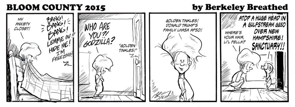 At the apex of the comic's heyday, the political pendulum swung conservative, and the scandal of the day starred televangelists Jim and Tammy Bakker. Now, a black Democratic president is finishing up an eight-year term, and the scandal of the day is a brand-new crisis careening uncontrollably around Facebook and Twitter feeds roughly every 24-48 hours. There has been ample fodder for Breathed to lampoon for years; though he won’t directly state his motives for resurrecting the strip at this point in time, Breathed hinted that the carpet-headed Donald Trump and his perennial foot-in-mouth syndrome brought Breathed back to cartooning. Already he has begun to crucify Trump with all the Letterman-esque zest we have sorely missed.