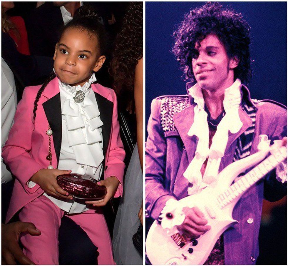 As the show progressed, she revealed even more of what made her the true star. Further analysis of her Grammys ensemble provided us with pink Prince vibes. Just a kindergartner, Blue is already showing signs of recognizing and emulating icons. Wearing a Gucci suit rumored at over $3,000 and rocking a diamond-encrusted kitty purse, she is already becoming a style icon in her own right.