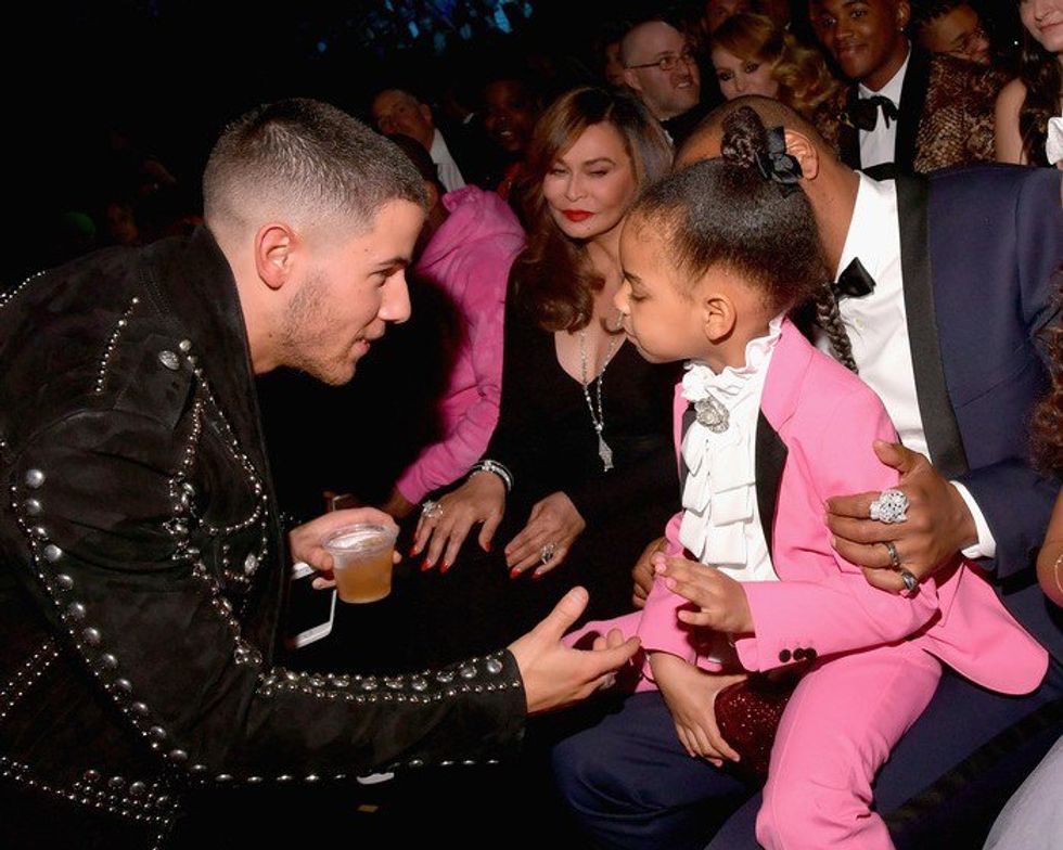 Blue is literally all of usHer mom wasn't the only star she had the honor of gracing with her loving presence. In this moment, she preciously tells "The Late Late Show" host and host of the night's Grammys James Corden that she watches him on her iPad. Here, she is looking out for Nick Jonas' best interests, knowing that what he is drinking is certainly not her mom's Lemonade, and he has certainly already had enough of whatever it is.