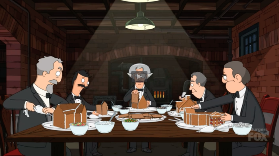 In this very strange Christmas episode, Bob summoned by Mr. Fishoeder and his other wealthy friends to a sort of dinner party, to deliver burgers. Mr. Fishoeder reveals that Bob is now a guest competitor, and every year, he and his friends gather to build gingerbread houses. However, Bob needs to lose the competition, intentionally. If Bob loses the competition, the Belchers won't have to pay rent for the next month. The winner of the competition gets a private cuddle session with an albino polar bear in the zoo. After being berated by Mr. Fishoeder, Bob decides he's going to compete for real and win the whole competition. Meanwhile, Linda, Teddy, and the kids go caroling in Mr. Fishoeder's neighborhood and encounter a house where it's rumored that a murdered lives there. The group carols around the neighborhood, finally encountering the supposed murderer, who joins in on their caroling and makes them hot cocoa. Bob ends up winning the competition so he gives the kids the gift of cuddling the albino polar bear.