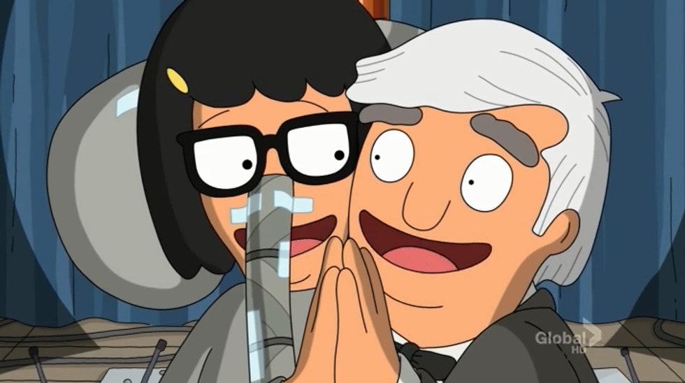 -Louise is really pissed off that the substitute teacher won't let her use the paper mache volcano she always uses. She decides to bring out the dark side of Thomas Edison and shows that he killed an elephant for an experiment and they show this through a musical number done with Gene and Tina but sung by their Aunt Gale and Mr. Fischoeder.