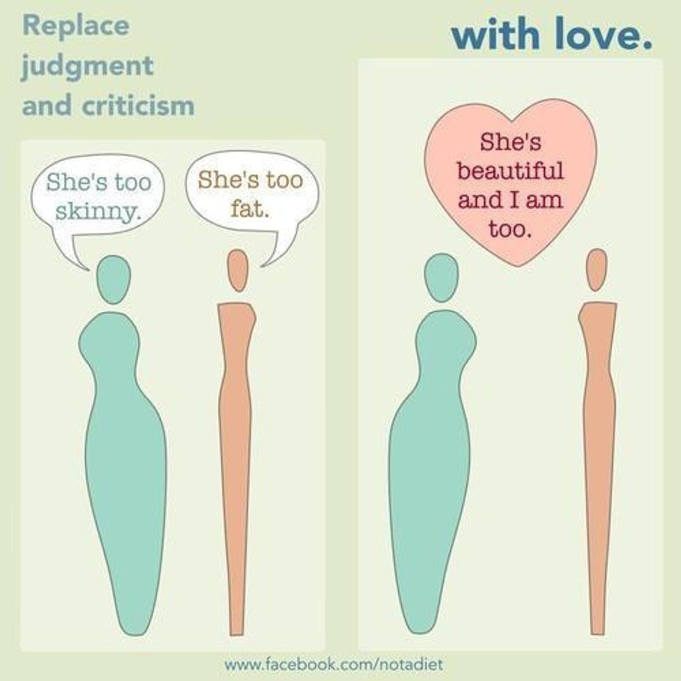 As human beings, we fail to realize we are not the number that appears on the scale, nor are we represented by our "bad side" in a photo. We choose to define ourselves by the less significant physical traits. Why should we feel ashamed of the size on the tag of our jeans, when one size up would offer us more comfort?