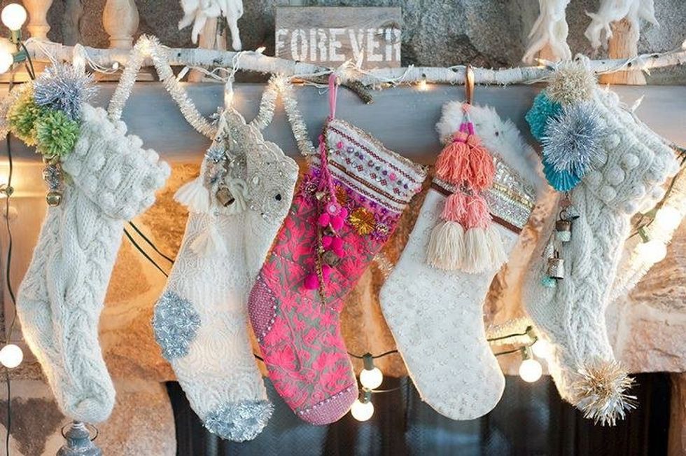 What You Need: Stockings (preferably non-traditional looking), tassels, jewels, pom poms, sequins, bells, etc., and hot glue