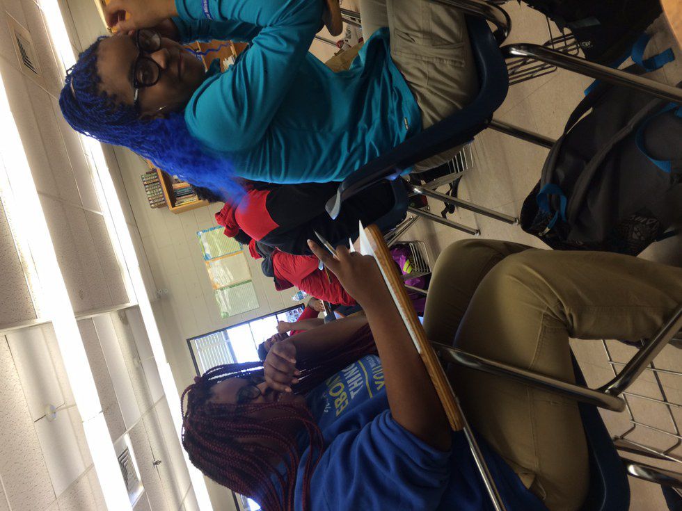 During English class, we had a couple of laughs! Actually, I would say a lot. We were always rocking the blue -- blue hair, blue hoodie, blue everything!