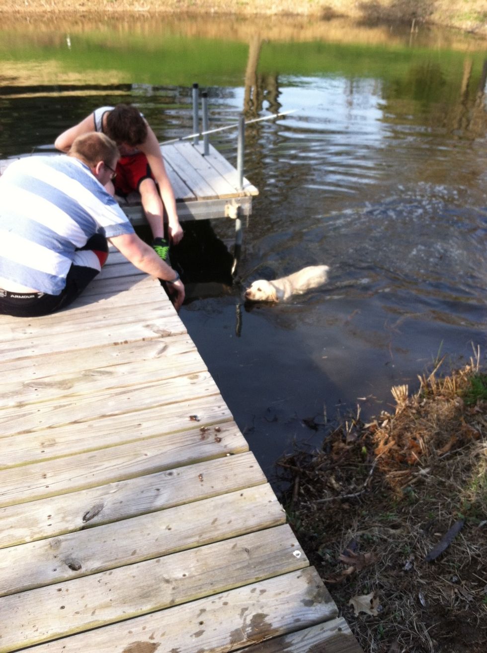 Bubby is swimming for the first time! He has loved swimming from the moment he jumped into the water to retrieve a stick.