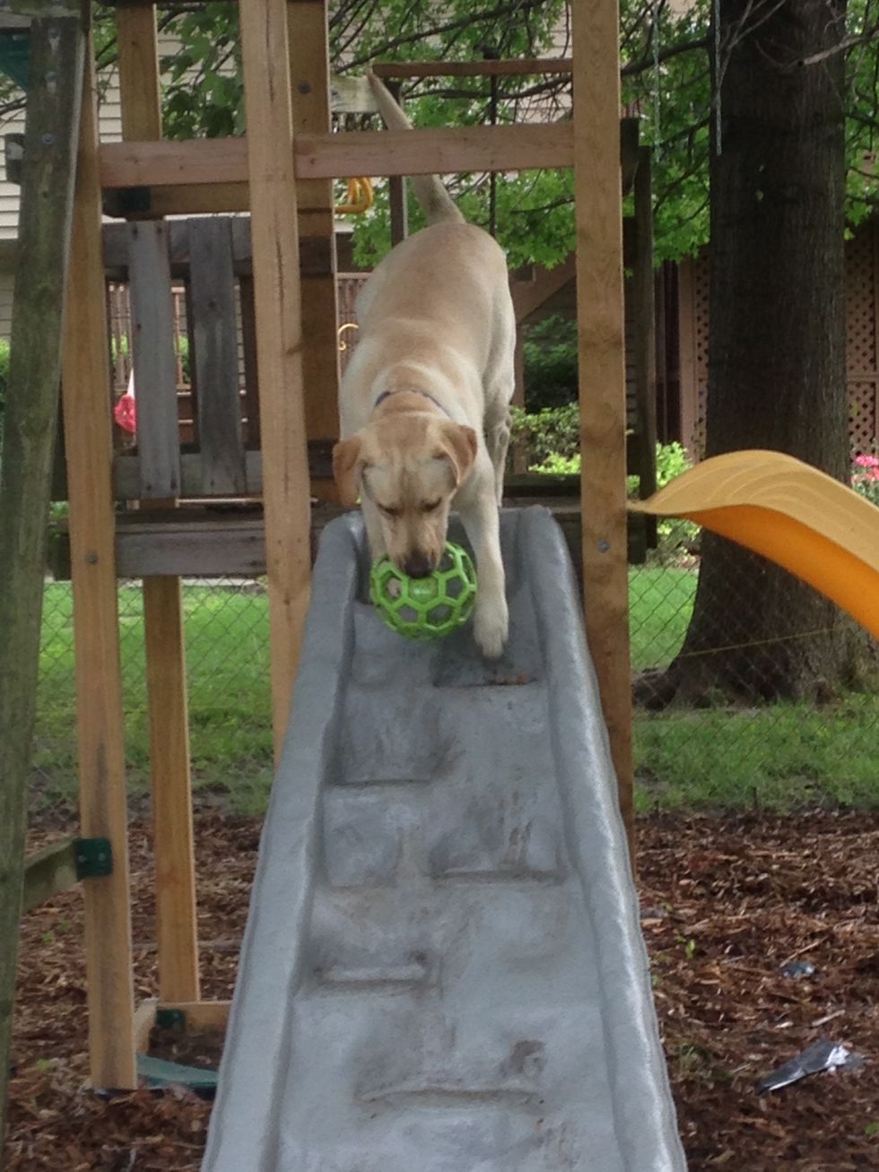 He loves playing with these kinds of balls! I have never found any toy he cannot destroy until we bought this at PetSmart. He also enjoyed climbing up this treehouse at our old rental house. Once somebody starts playing with him, he won't stop playing. Throw the ball to him at your own risk.