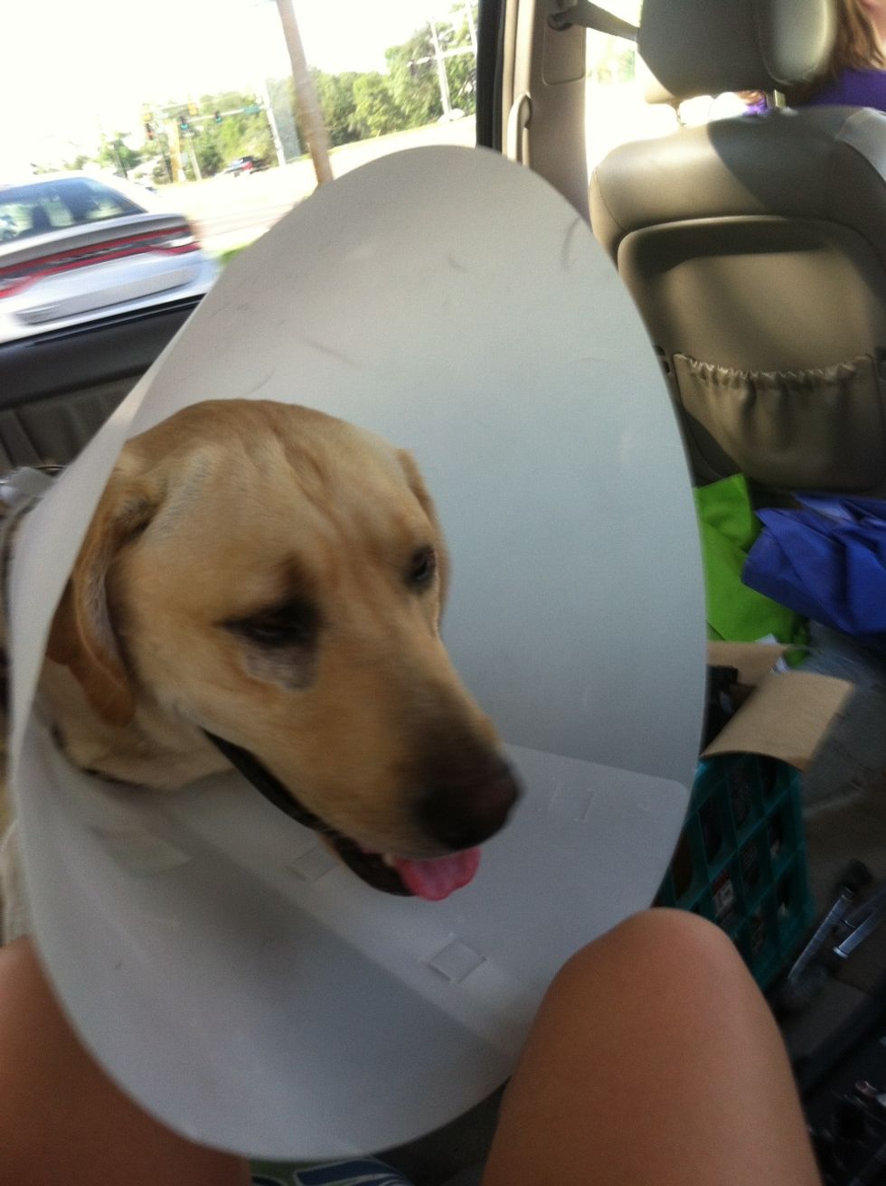 Here we are wearing the cone of shame! The way his eyelids were growing made it look like he was crying, so we had to get that minor surgery done by our fantastic vet when we lived in Illinois! He also had his hips x-rayed while he was there. He, unfortunately, had one bad hip, so they had to neuter him. Not surprisingly, both surgeries did what they were supposed to do! Sometimes, you have to kill two birds with one stone.