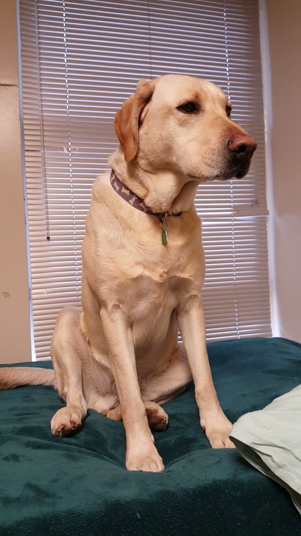 Boomer was probably a little bit heavier than 80 pounds at 8.5 months old when he suddenly decided to sit on my lap. I think he was looking for me to defend him after taking one of our beach towels.