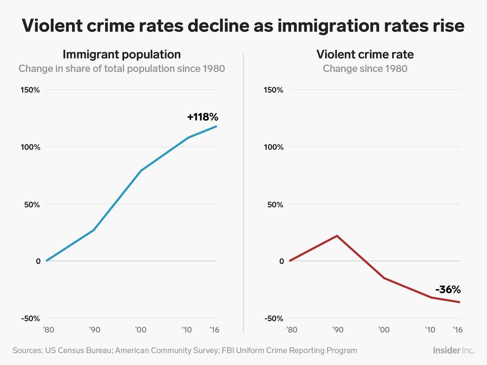 A study done by the Journal of Ethnicity in December 2016 found that from 1980 through 2016 there was a 118% increase in the United States' immigrant population, yet there was a 36% decrease in violent crime during this time.