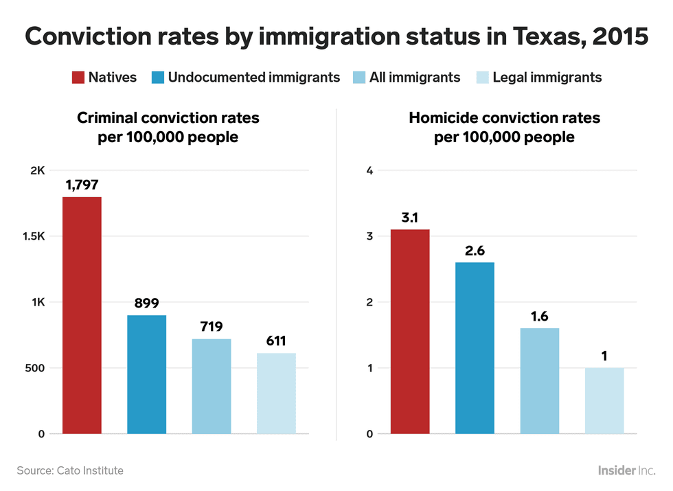Second of all, it is ignorant to say that too many Americans have been murdered by undocumented immigrants when native-born Americans are more likely to be murderers than undocumented immigrants, according to a study done by the Cato Institute in February 2018. Their study looked at the conviction rates by immigration status in Texas because it is the state with the second-largest population of foreigners. The native-born residents were not only more likely to be murderers, but they were also more likely to commit crimes in general than their immigrant counterparts, both undocumented and documented.