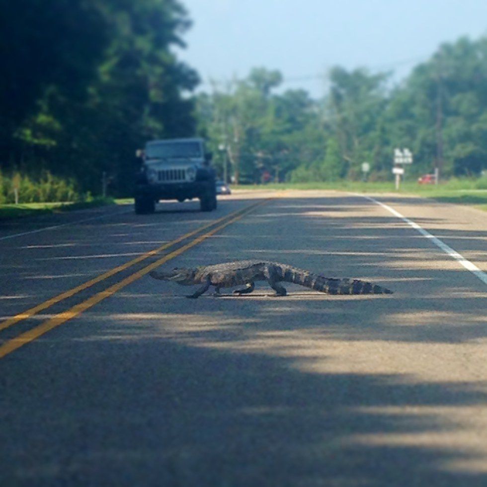No, I’m not living in the middle of a swamp and having to wear boots and overalls and driving an airboat to get everywhere. There’s a lot more diverse landscapes to our state than just swamps. Maybe you should do your research. But I must admit, I did have to stop the car for an alligator crossing the road once. Don't believe me? Here's my proof: