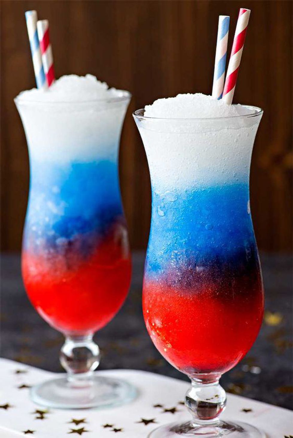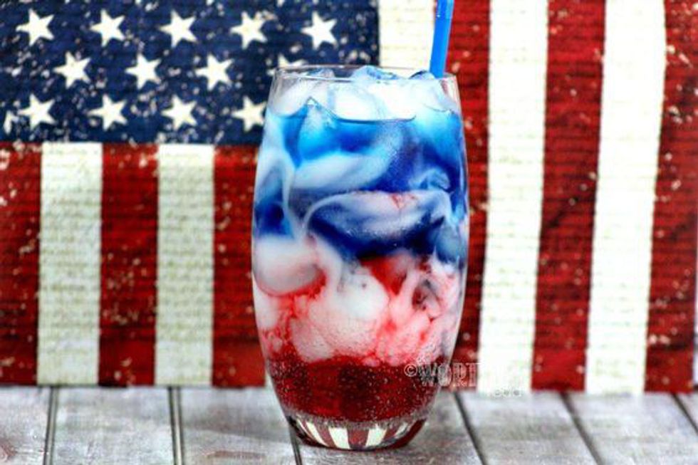 Although this drink is required to be served immediately, this slush will be sure to keep you and your loved ones cool all day, (and get you feeling some type of way). It's patriotic look will also make slurping this slush even more fun! ---- Click the link for the detailed recipe.