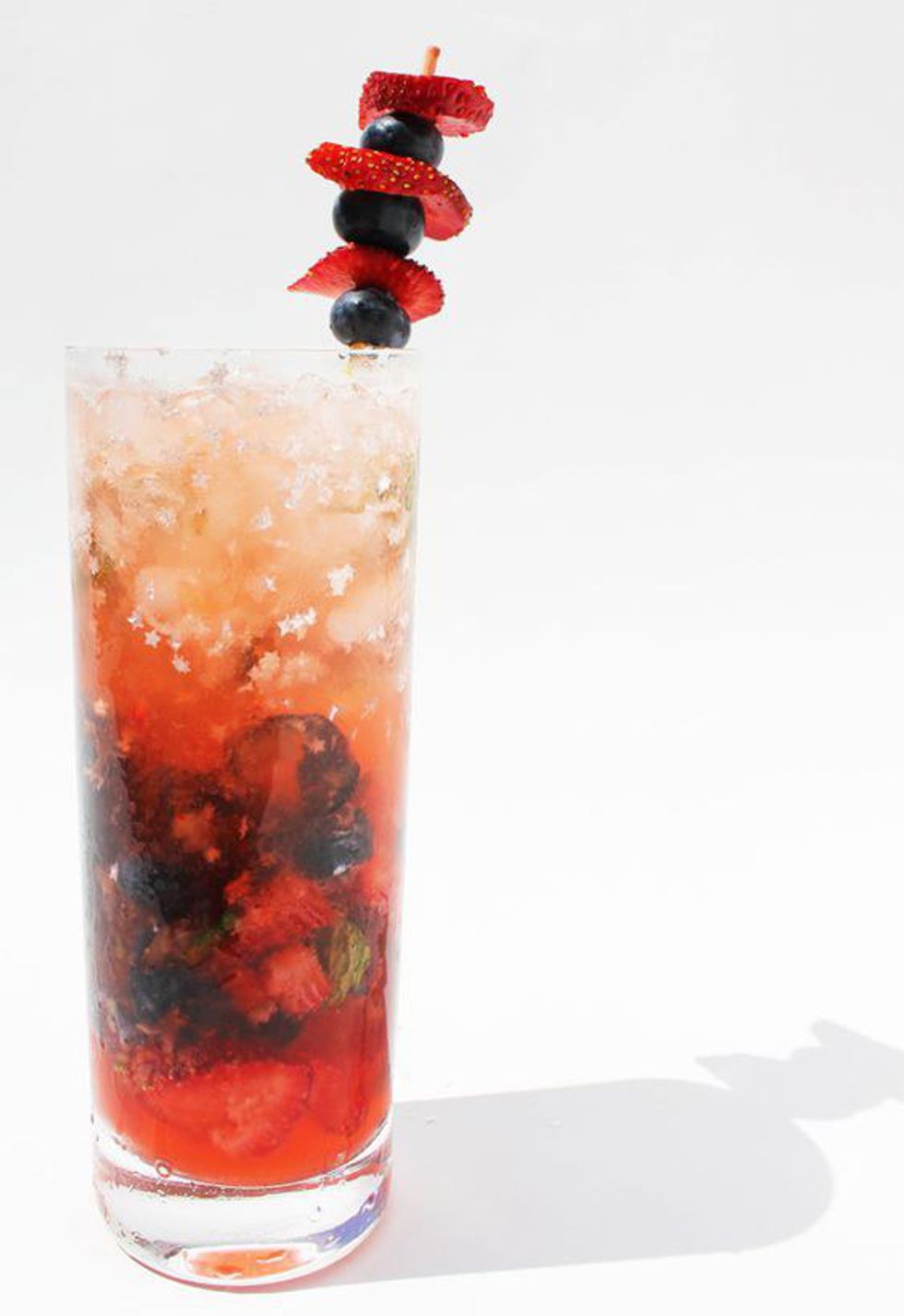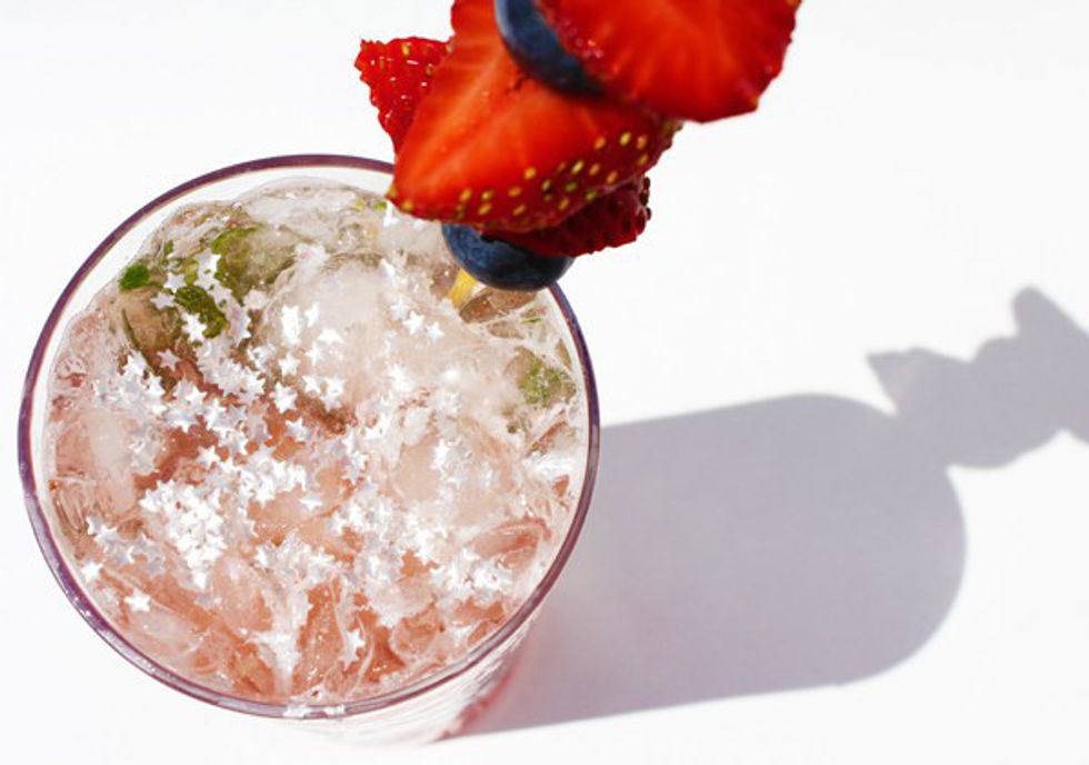 A perfect day for this festive and refreshing mojito! You mix lime juice, simple syrup, mint, strawberries and blueberries. Add rum and stir. Fill your glass with ice and top with some club soda. Garnish with a skewer of strawberries and blueberries and sprinkle edible glitter stars on top for some 4th of July fun!