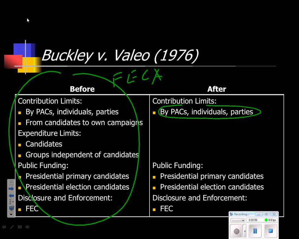 We then fast forward with the creation of the Federal Election Commission Act of 1971. After the Watergate scandal in 1972 and Nixon’s resignation in 1974, the FECA was then expanded with a series of amendments. Its main job was to level the playing field and to make it so that one PAC is not more powerful than the other. It limited hard money (the amount of money that one individual could give directly to one PAC), created disclosure laws (not giving money in secret), and started the “idea” of publicly financed elections. But in 1975, a New York Senator named James L. Buckley (older brother of William F. Buckley Jr. whom there is a new documentary on Netflix called Best of Enemies that I highly recommend) sued the FEC, claiming that limiting campaign contributions was against the first amendment. The outcome was that all of the restrictions of the new FEC laws were constitutional, except the court said that candidates have the right to spend as much as they want along with groups independent of candidates like the NRA or lobbying groups. PAC’s still had a cap of spending to it though, as seen in the picture below.