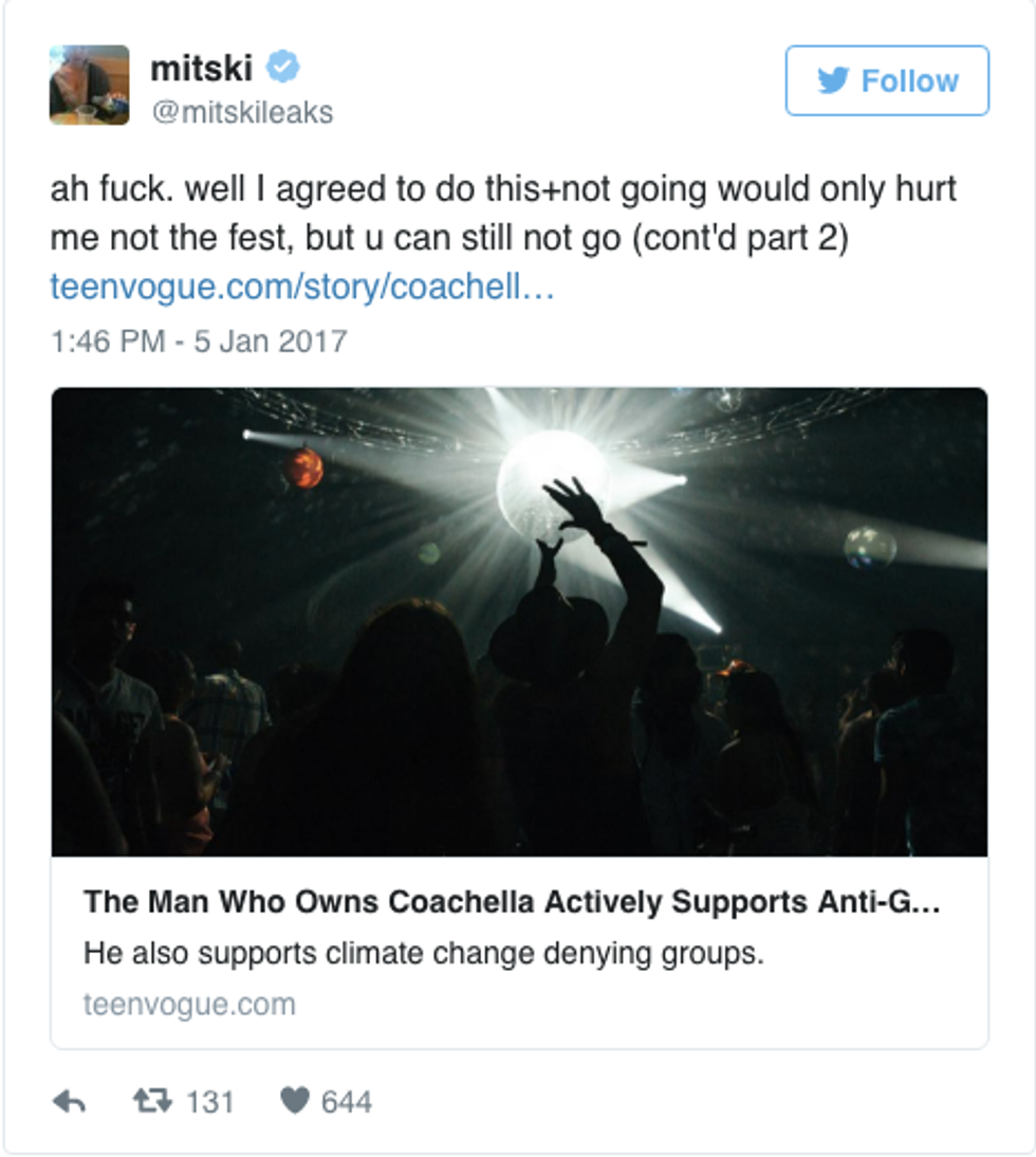 While many artists haven't officially commented on these developments, Mitski took to Twitter to voice her disappointment: