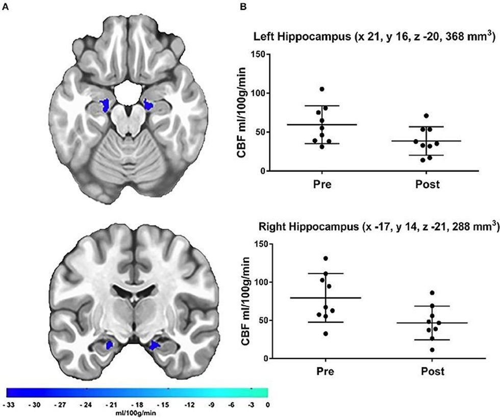 It was found that in just 10 days, there was slow regional cerebral blood flow in eight different areas of the brain. Blood flow notably slowed in both the left and right hippocampus, the part of the brain that is necessary for memory formation, storage and retrieval.