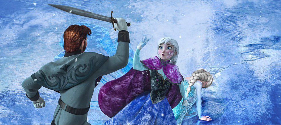 Anna, though her own life is slowly waning as her heart is turning to ice, steps in front of Elsa right before Prince Hans brings the sword down upon her. Using her last breath to save her sister's life, rather than her own.